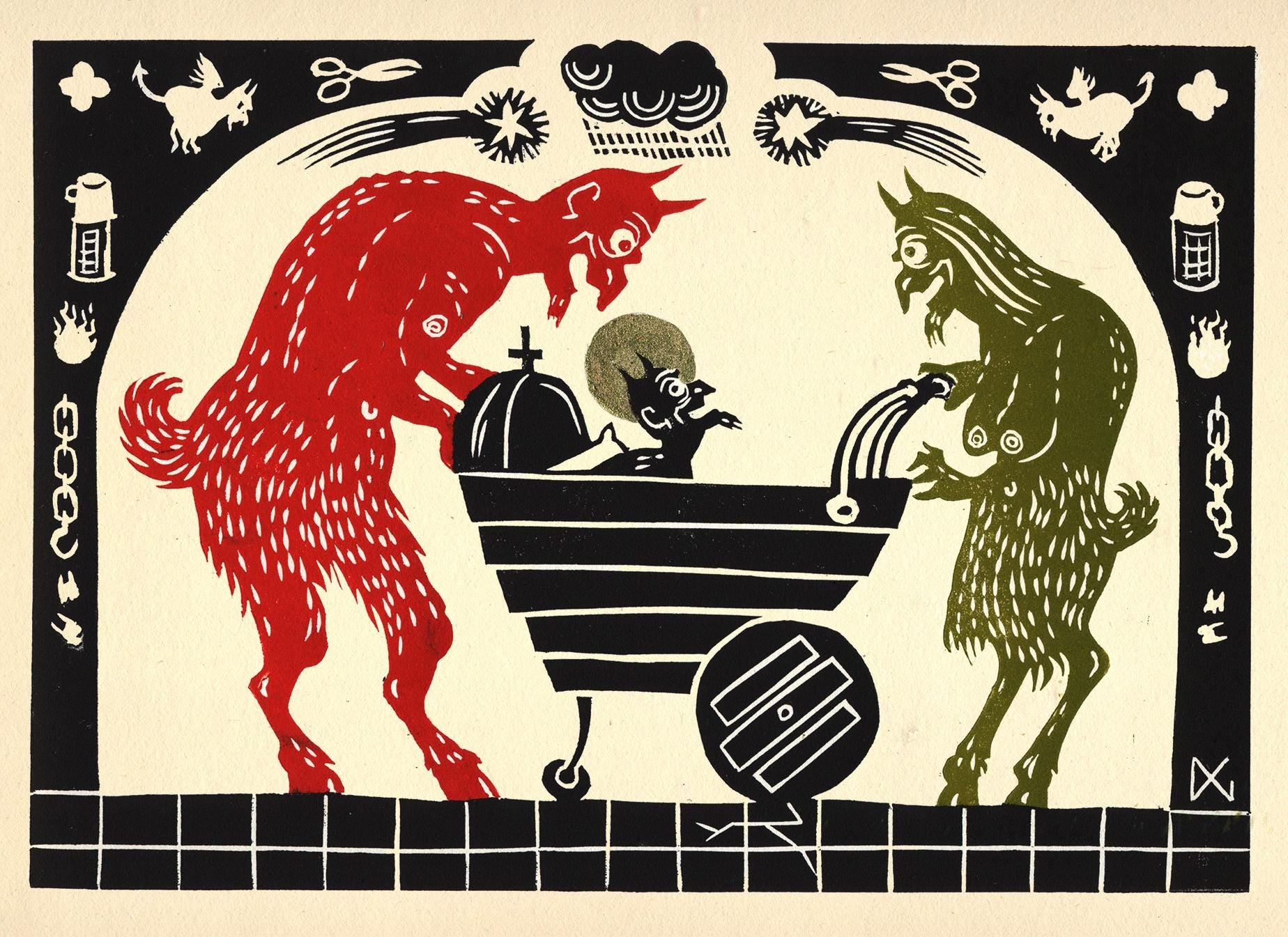 A wonderful nativity scene featuring the Devil and his new wife and their newborn baby. They are admiring his beautiful looks.