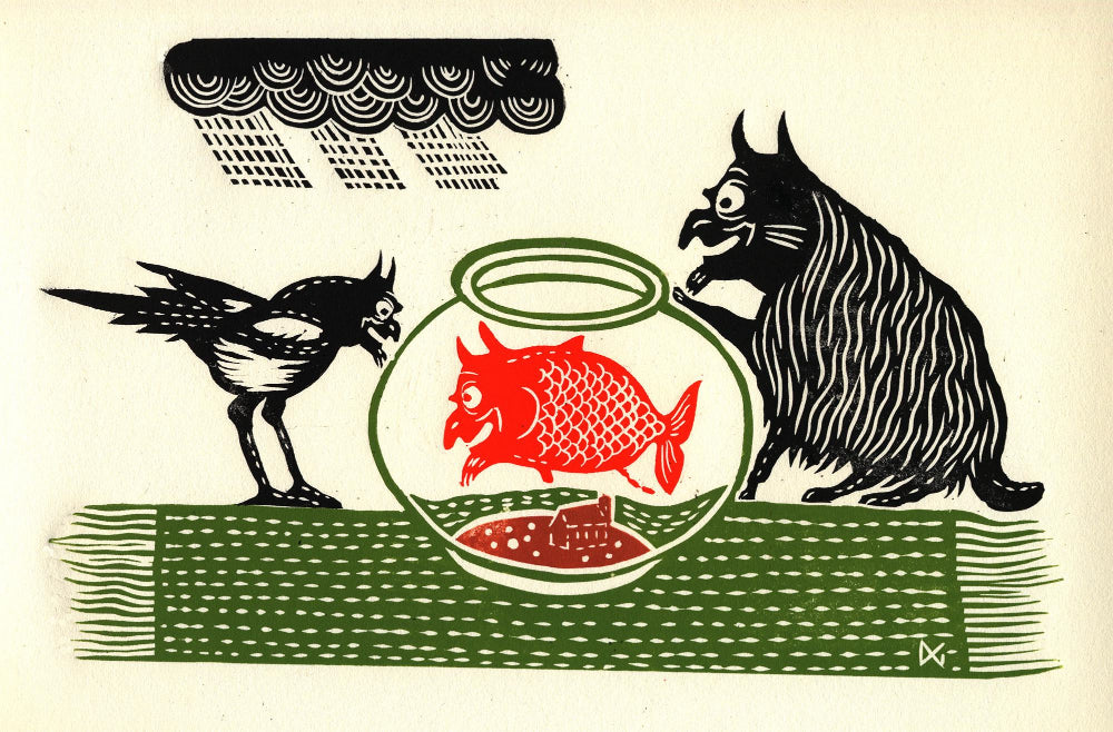 4 colour linocut. 26 cms x 16 cms
