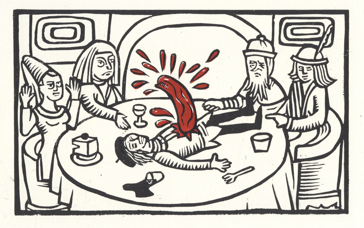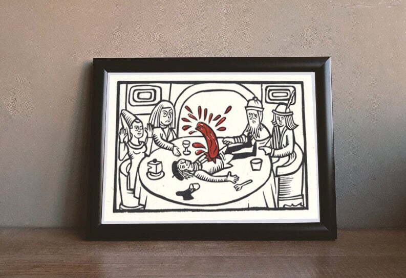 Hand printed 2 colour linocut of a medieval version of a movie scene with a humorous twist