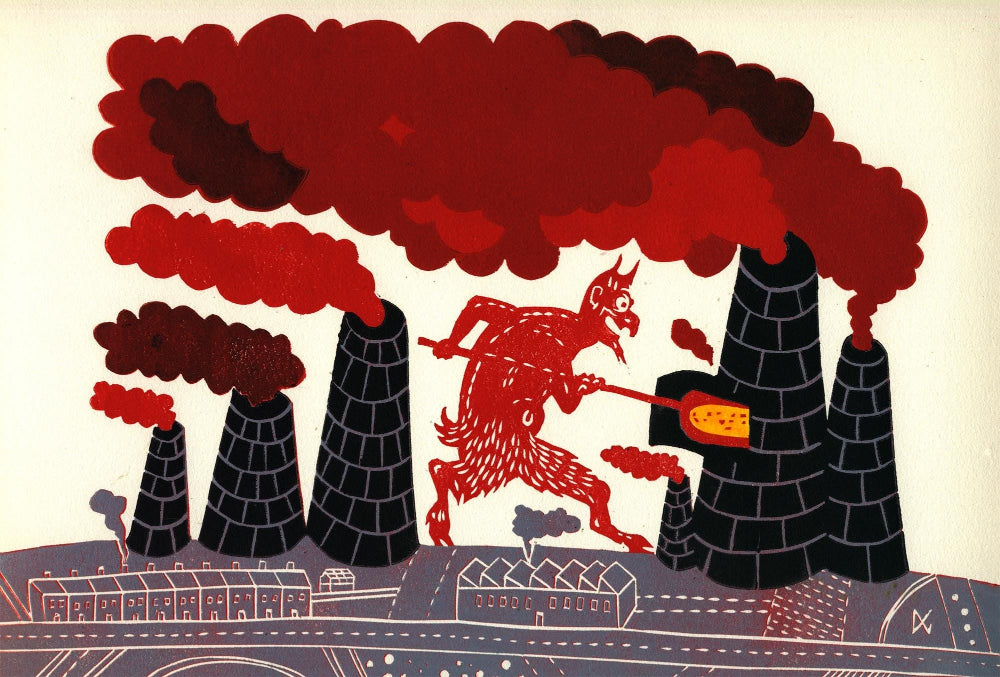 A linocut depiction of the Devil cooking one of his 'dark, satanic meals' surrounded by chimneys and smoke. Multi colour linocut print, edition of 30.